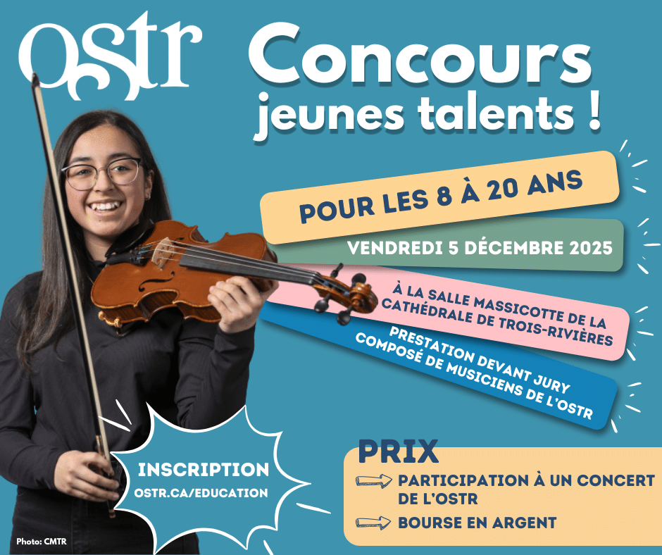 L’Orchestre symphonique de Trois-Rivières est heureux d’annoncer la tenue de son Concours de jeunes talents, qui aura lieu le vendredi 5 décembre prochain. Cet événement veut mettre en lumière la relève musicale de la région et offre une vitrine exceptionnelle aux jeunes musiciens âgés de 8 à 20 ans.